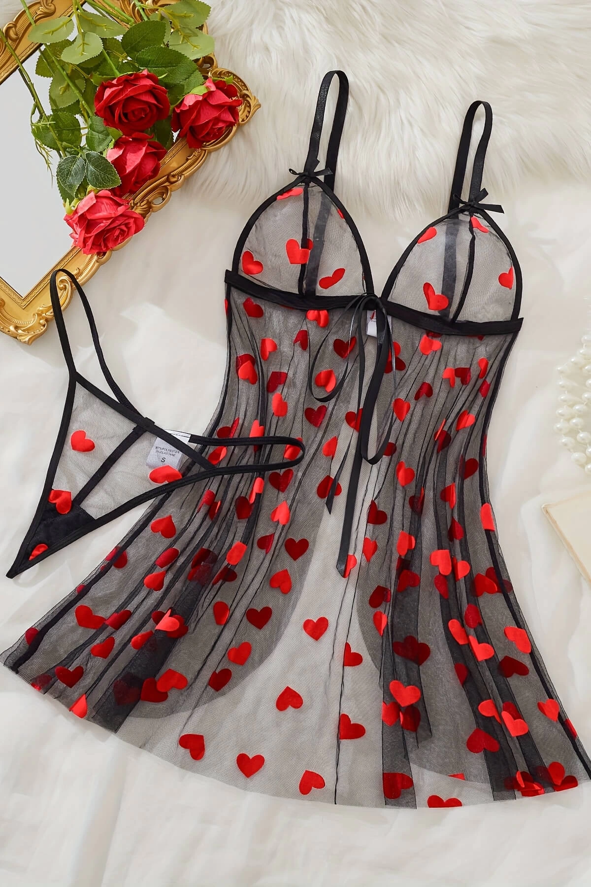 Kalp Desenli Siyah Transparan Gecelik TM1378
